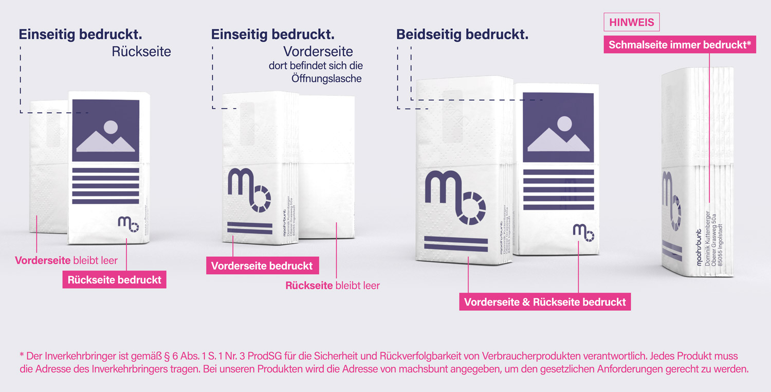 Sie haben fertige Layouts? Laden Sie diese direkt im Warenkorb hoch. Der Digitaldruck setzt Logos, Hausschriften und definierte Farbwerte präzise um. Damit eignen sich diese Werbeartikel Taschentücher perfekt für Kampagnen, die 100 % CI-konform sein müssen. Besonders, wenn Sie zum ersten Mal Taschentücher bedrucken lassen, profitieren Sie von unserem Service des kostenlosen Datencheck's sowie unserer Erfahrung in der detailgenauen Umsetzung – und von Preisen, die im Marktvergleich überzeugen.